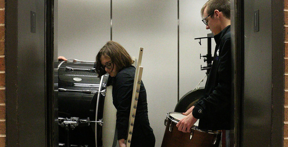 Other instruments will trickle in, too. Those, along with the more manageable marimba parts, will have taken a ride on the music building elevator if they were small enough to fit.
